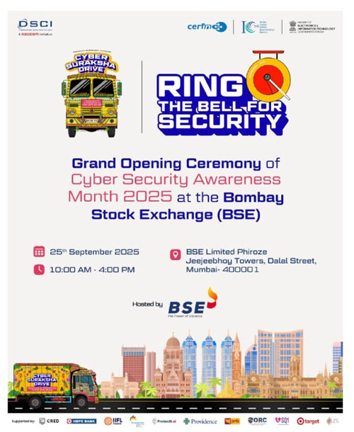 मुंबई : डिजिटल सुरक्षिततेला प्रोत्साहन देण्यासाठी व सर्वांसाठी सुरक्षित सायबर व्यवहार निर्माण करण्यासाठी डेटा सिक्युरिटी कौन्सिल ऑफ इंडियामार्फत २५ सप्टेंबर 2025 रोजी बॉम्बे स्टॉक एक्सचेंज (BSE) येथे ‘रिंग द बेल फॉर सिक्युरिटी’ या अभियानाचे आयोजन करण्यात आले आहे. या अभियानातून देशव्यापी सायबर सुरक्षा जनजागृती महिना (CSAM) 2025 राबविण्यात येणार आहे. या अभियानाचे उद्घाटन माहिती तंत्रज्ञान व सांस्कृतिक कार्य मंत्री ॲड.आशिष शेलार यांच्या हस्ते होणार असून, मुख्यमंत्र्यांचे गुंतवणूक सल्लागार कौस्तुभ धवसे, माहिती व जनसंपर्क महासंचालनालयाचे प्रधान सचिव तथा महासंचालक ब्रिजेश सिंह, तसेच गृहमंत्रालय, क्रेट-इन (CERT-In), सेबी (SEBI) आणि बीएसई (BSE) यांचे मान्यवर या वेळी उपस्थित राहणार आहेत.